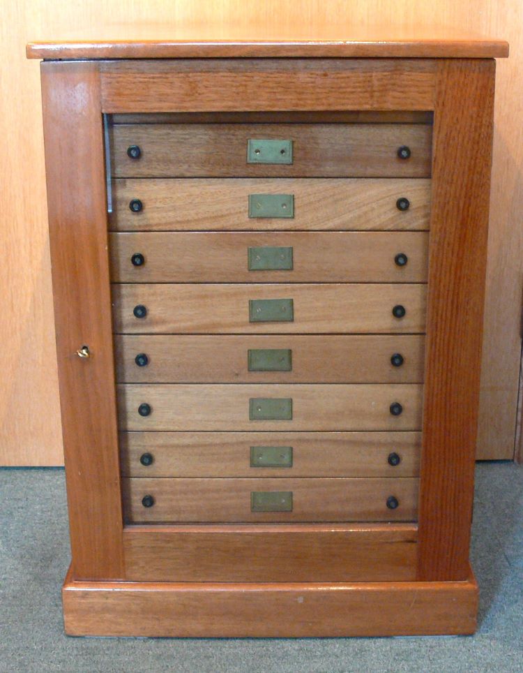 Drawers on hidden runners with bakelite knobs and brass label holders, lift off framed glass lids and integral camphor cell.